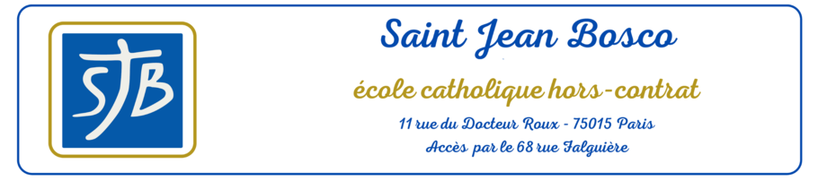 L'école Saint Jean Bosco est un établissement privé d'enseignement primaire qui existe depuis 1979. Cette école, hors contrat et catholique, [n°RNE 075 288827] est reconnue comme telle par le Diocèse de Paris. Depuis 2010, ses locaux sont installés à la paroisse saint Jean-Baptiste de La Salle, au coeur du XV° arrondissement de Paris.