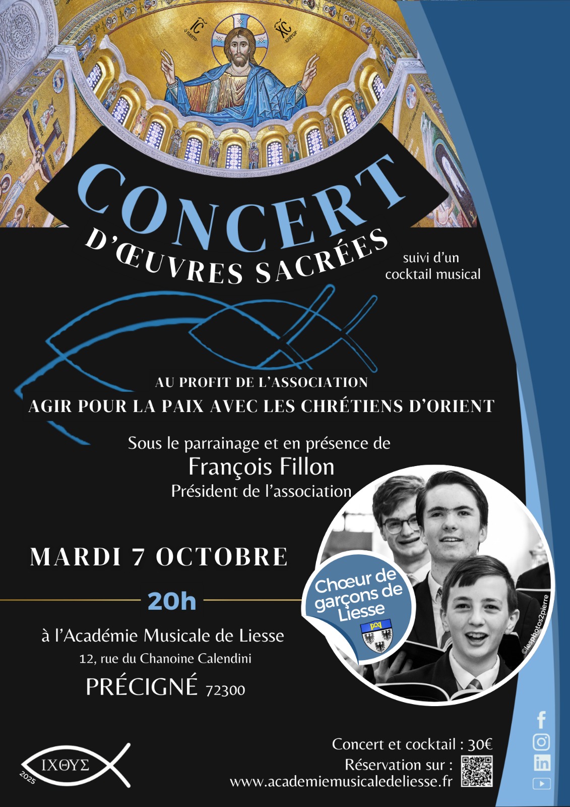 Venez écouter les chœurs de garçons de l’Académie Musicale de Liesse dans un concert d’œuvres sacrées, suivi d’un cocktail musical. Un événement au profit de l’association Agir pour la Paix avec les Chrétiens d’Orient. Évènement parrainé par François Fillion Président de l’association.